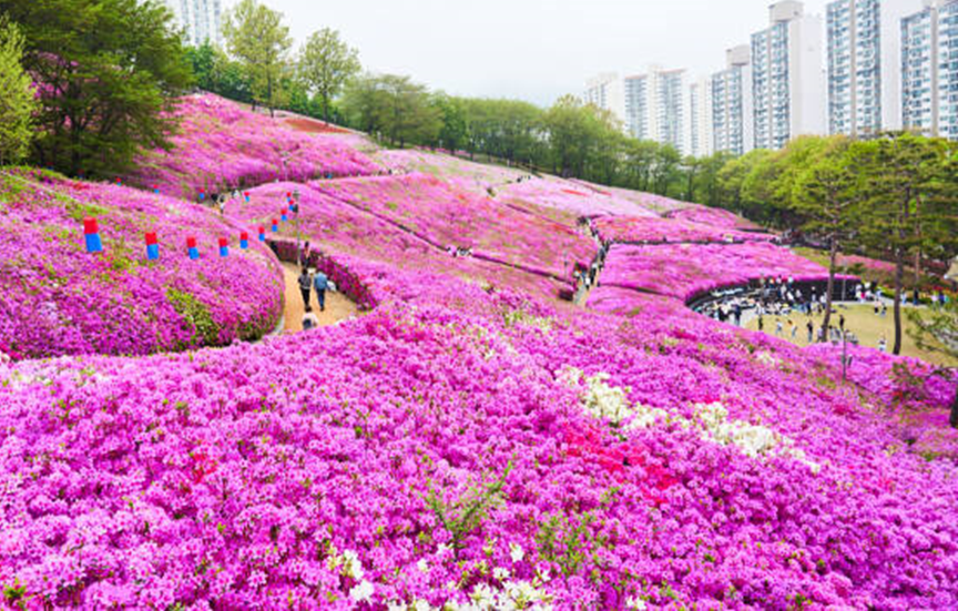 군포 철쭉축제의 주 무대인 철쭉동산은 수리산역 바로 인근에 위치하여 접근성이 매우 뛰어납니다. 낮은 언덕 전체를 가득 메운 철쭉 군락은 그 규모와 화려함에서 단연 압도적입니다. 만개 시기에는 발 디딜 틈 없이 활짝 핀 진분홍, 연분홍, 보랏빛 철쭉들이 어우러져 그야말로 '꽃대궐'을 이룹니다. 언덕 위 전망대나 산책로 곳곳에서 바라보는 풍경은 감탄을 자아내며, 어디서 사진을 찍어도 인생샷을 남길 수 있는 최고의 포토 스팟입니다. 도심 가까이에서 이토록 화려하고 풍성한 봄꽃의 향연을 만끽할 수 있다는 것이 군포 철쭉동산의 가장 큰 매력입니다.